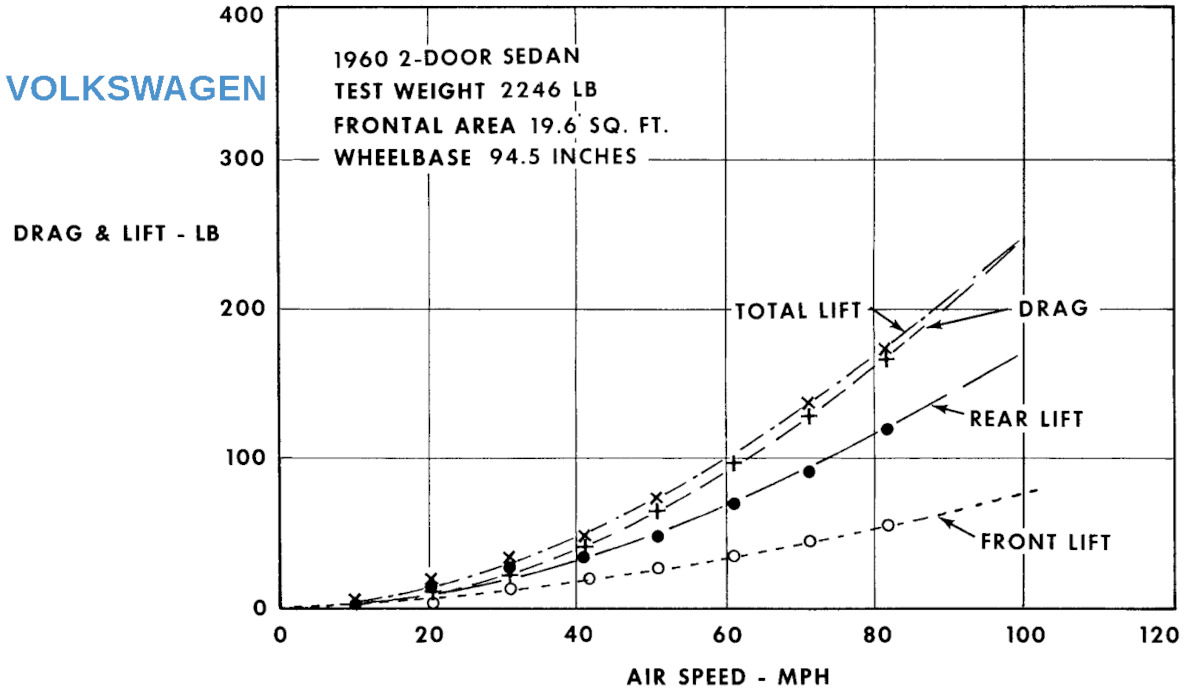 The Volkswagen sedan — not yet officially called a “Beetle,” as I’m sure someone will remind me if I don’t point it out — was designed in the 1930s, and its aerodynamics would have been quite good back then. For 1960, they could have been worse. The Type 1 body suffered a lot of rear-end lift, which was much worse than the Dauphine even at 50–60 mph.