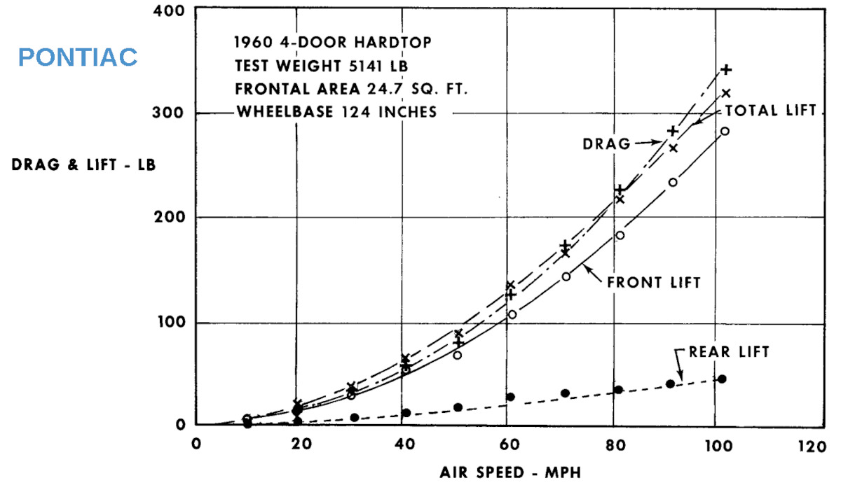 There was an additional car in the Ford test data that Heltemes didn’t include, maybe because he couldn’t positively identify it: It was another four-door hardtop on a 126-inch wheelbase, a frontal area of 25.8 square feet, and a test weight of 5,069 lb. Based on that, I think it might have been a 1960 Mercury Park Lane. Its total drag was less than the Galaxie (around 200 lb at 80 mph) and it had less lift (around 250 lb at 80 mph), although was still a lot.
