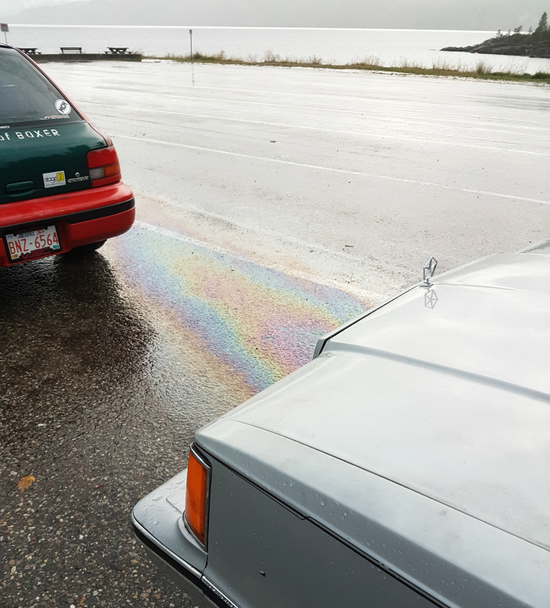 We managed to catch the Subaru team who had trouble with their clutch cable. Like all extended stops I popped the hood to disconnect the battery to prevent it running down while waiting due to the electrical draw related to my alternator fix (bodge). When I closed the hood I noticed my car and the rain had conspired to paint a rainbow on the ground. My apologies British Columbia! At the time I was incorrectly assuming it was a bit of oil and nothing to worry over.