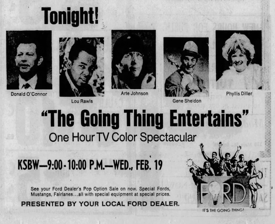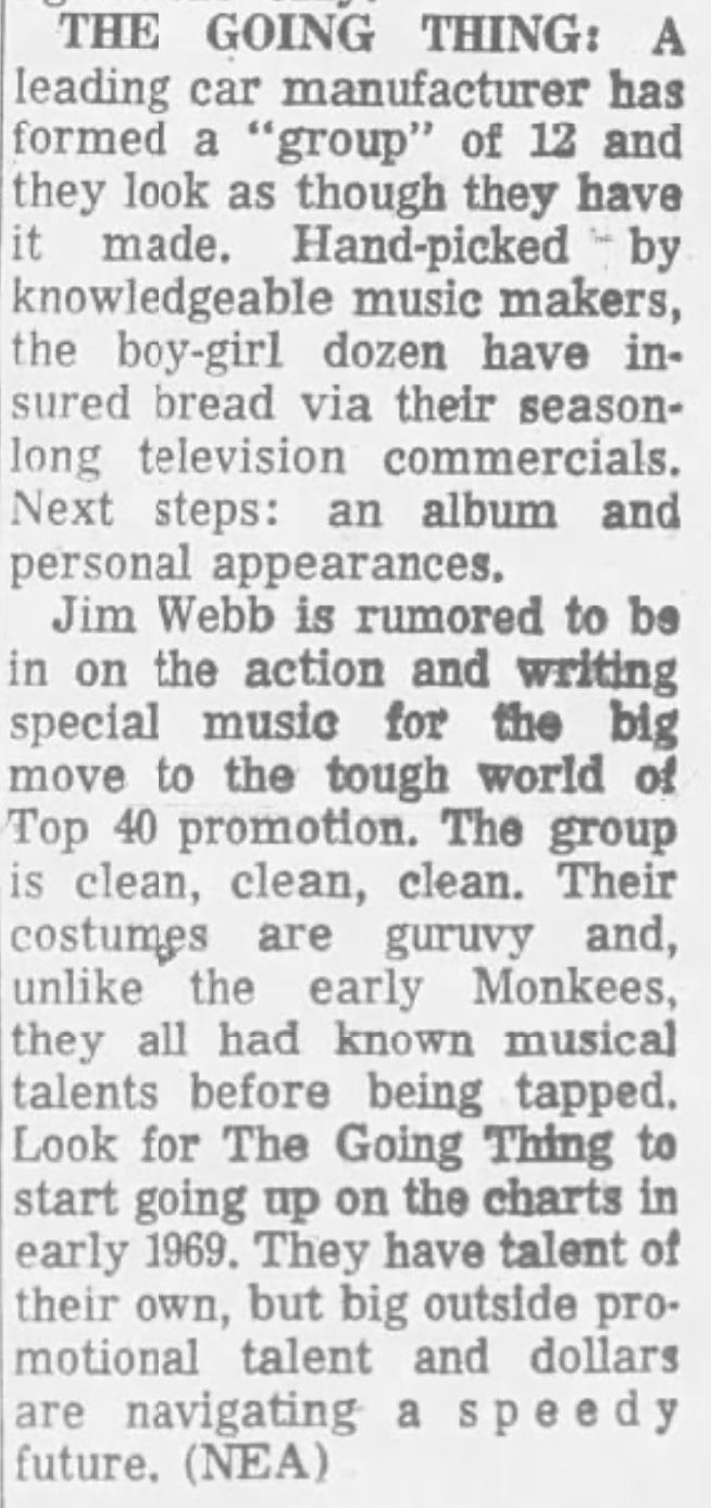 Ford’s 1968-1969-ish “The Going Thing” campaign was all over radio ads and newspapers, and then they offered the $$$$ to have top music industry talent audition and assemble the pop-rock “The Going Thing” ensemble (sorta like a bigger “The Fifth Dimension”) that was getting radio play, TV appearances, etc. (This is December 1968):